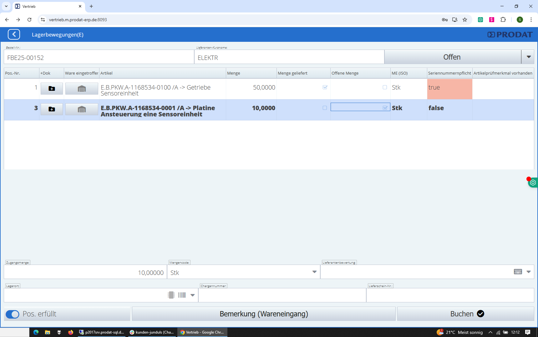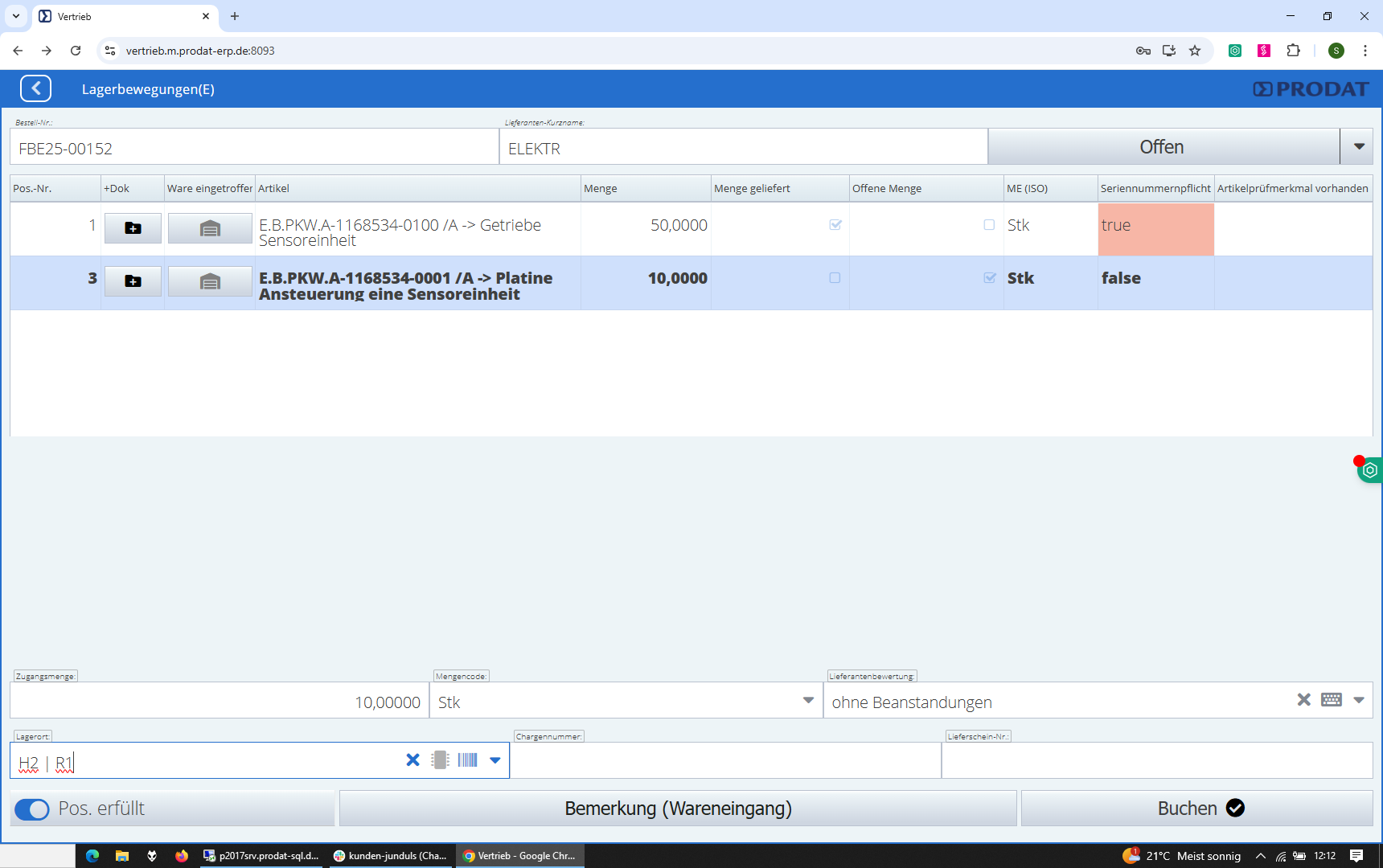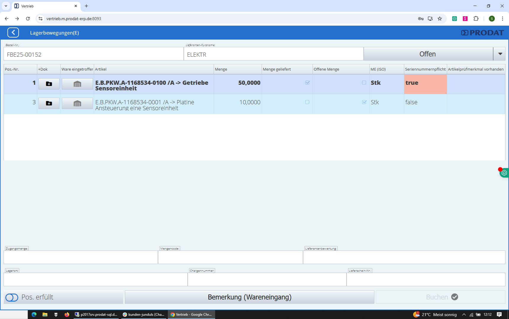 Artikel mit Seriennummern oder Prüfmerkmalen müssen weiterhin über die PRODAT Module gebucht werden.