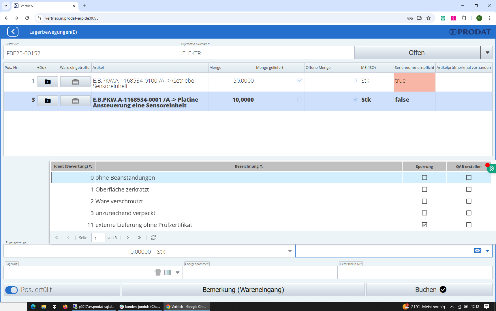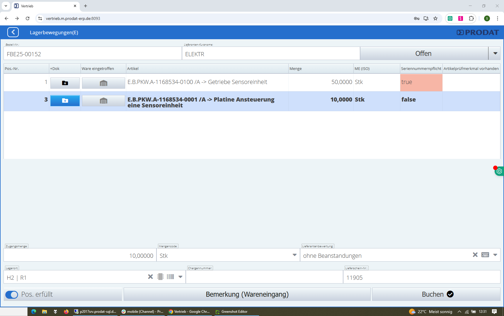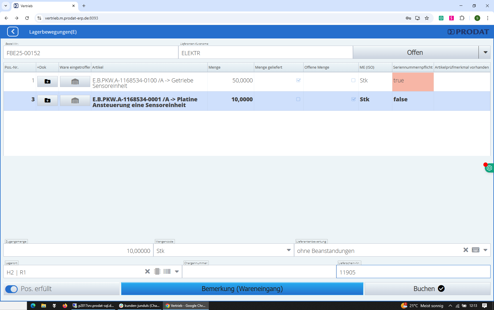 Artikel mit Seriennummern oder Prüfmerkmalen müssen weiterhin über die PRODAT Module gebucht werden.