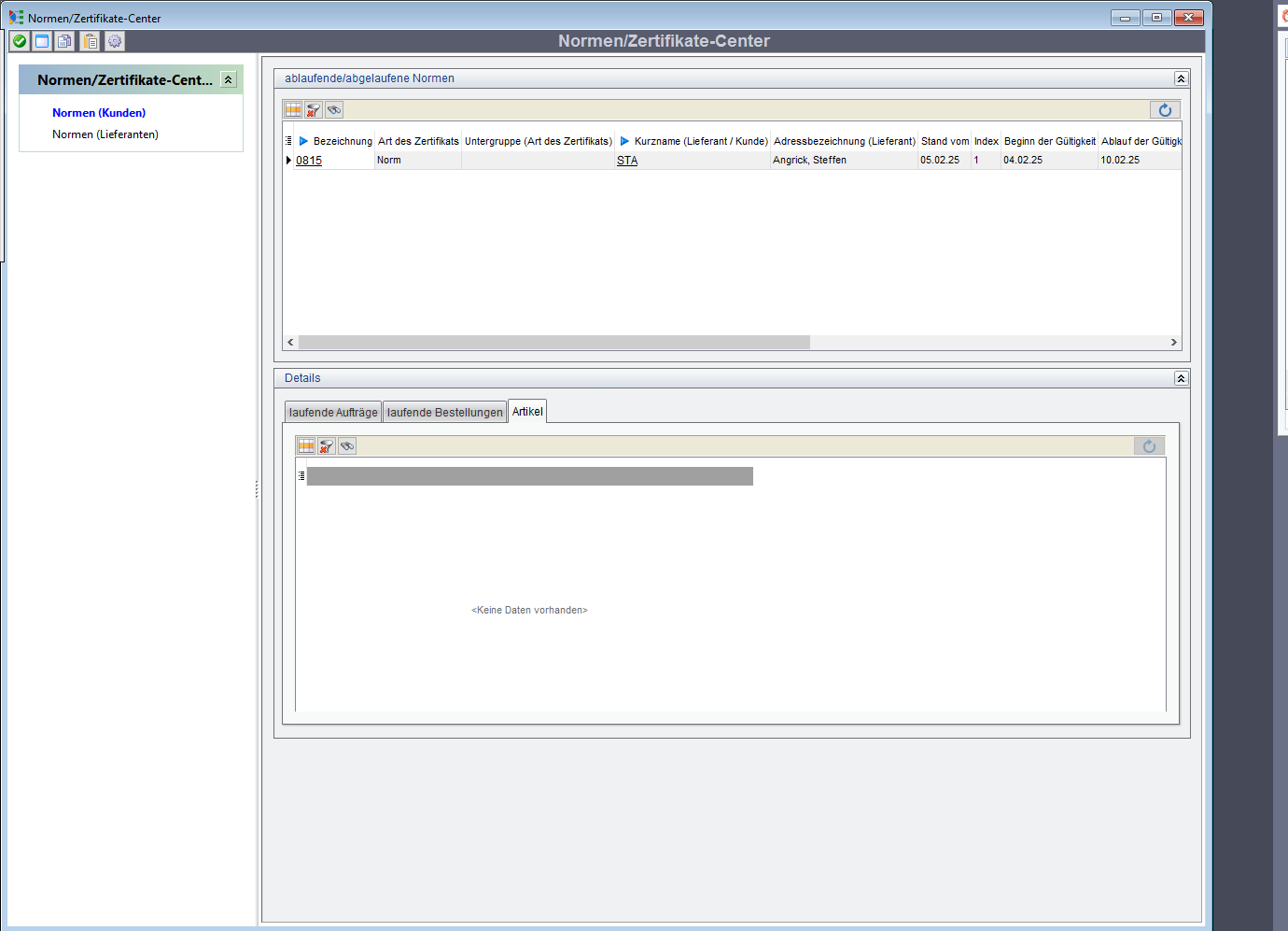Assistent zur Überwachung der Gültigkeit der Normen/Zertifikate (lieferantenseitig)