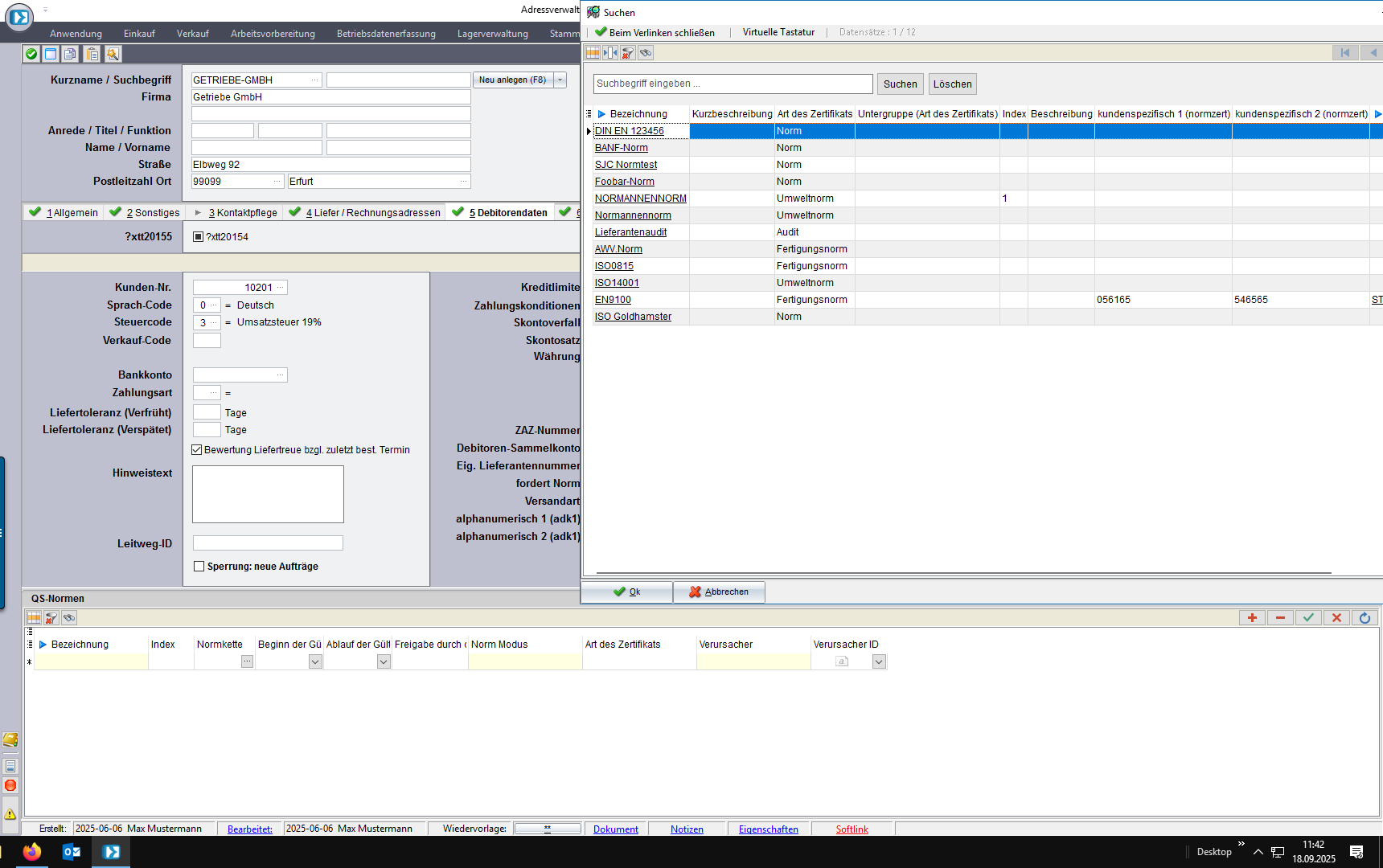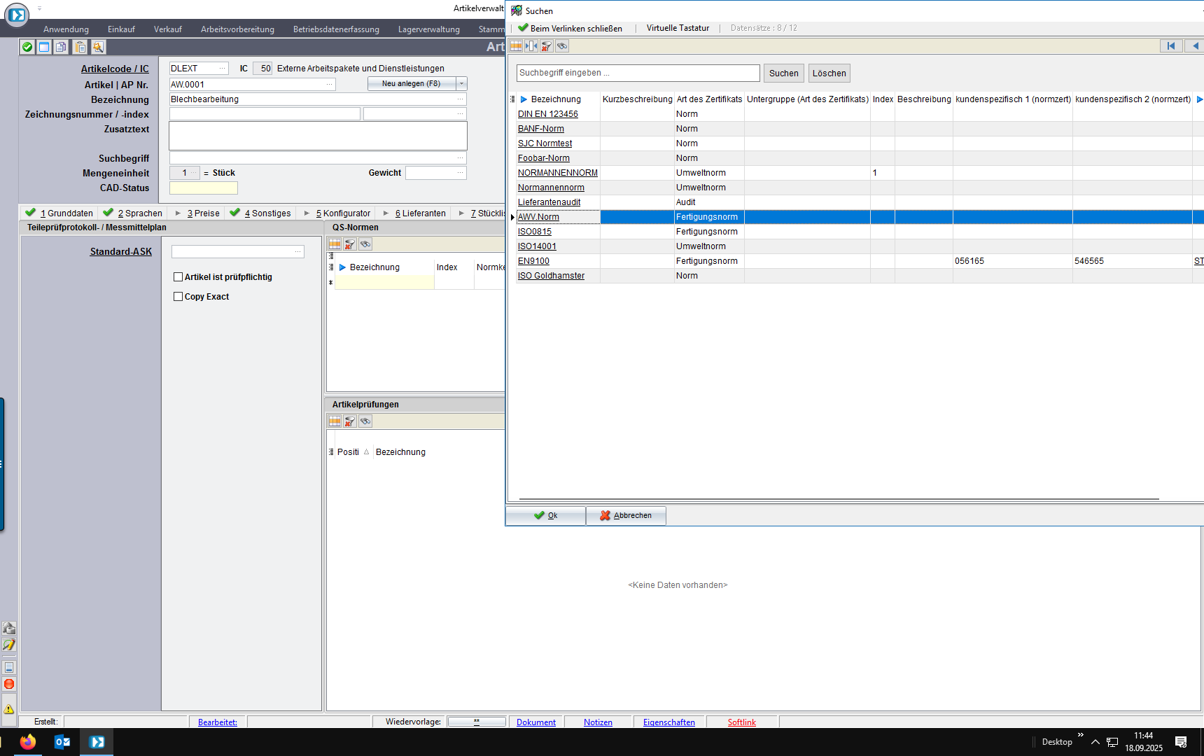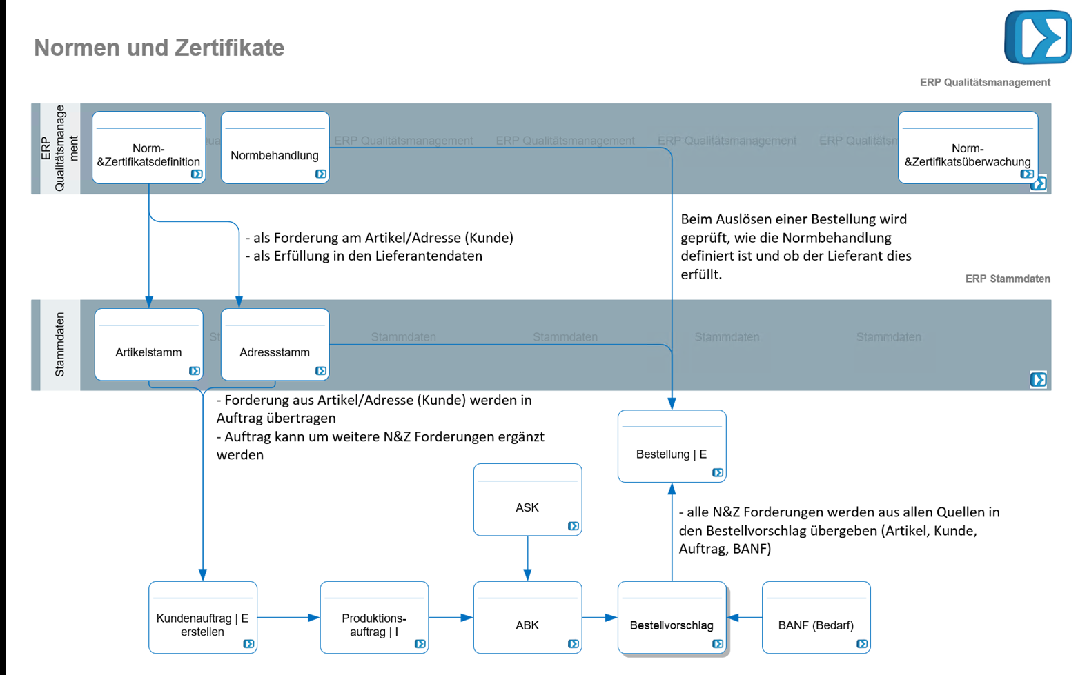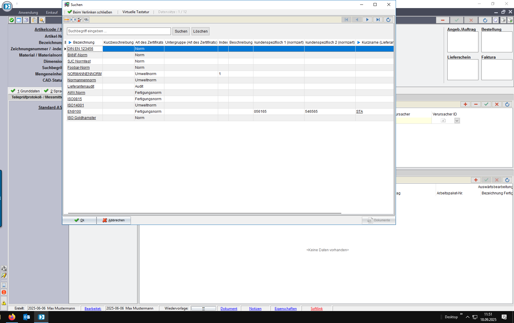 Wird ein Kundenauftrag, eine ABK oder eine BANF angelegt, prüft das System automatisch, ob Artikel/Adresse eine Norm oder ein Zertifikat fordert.