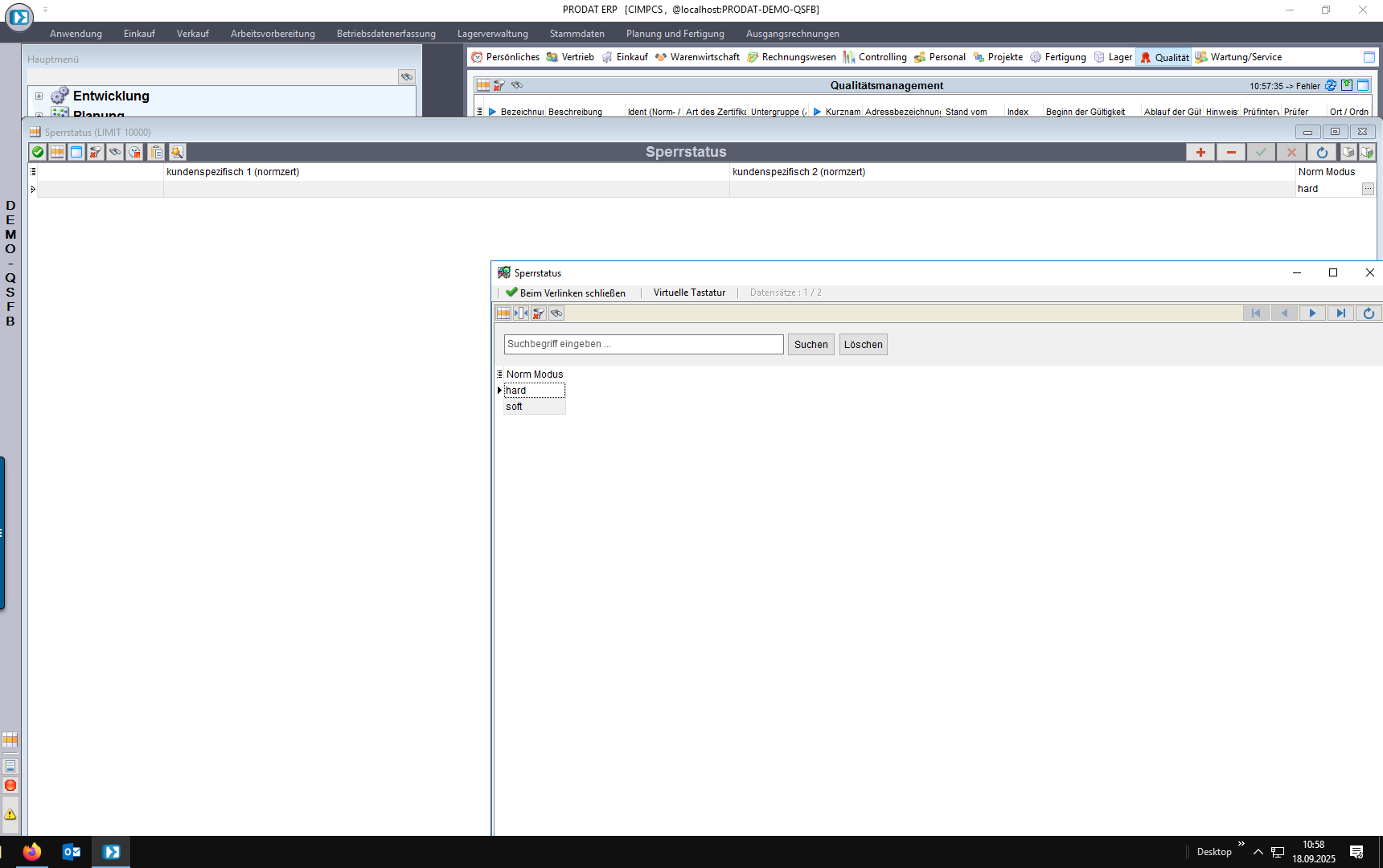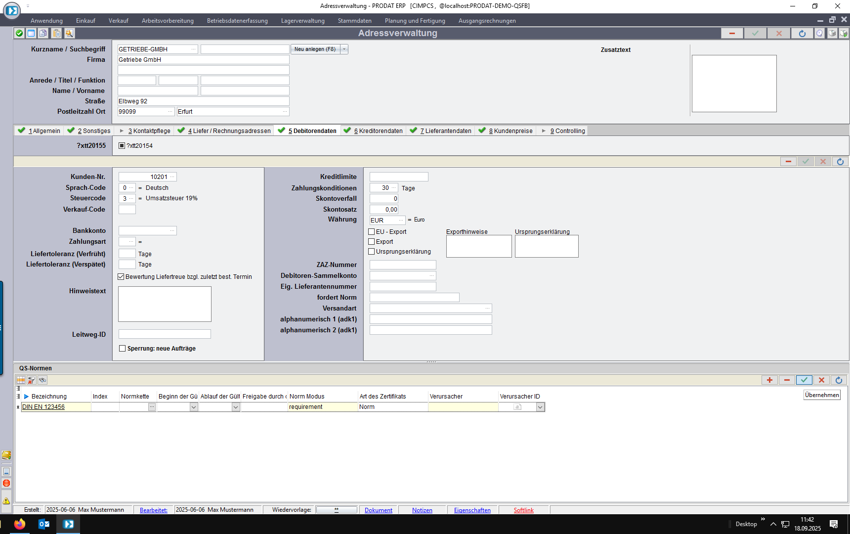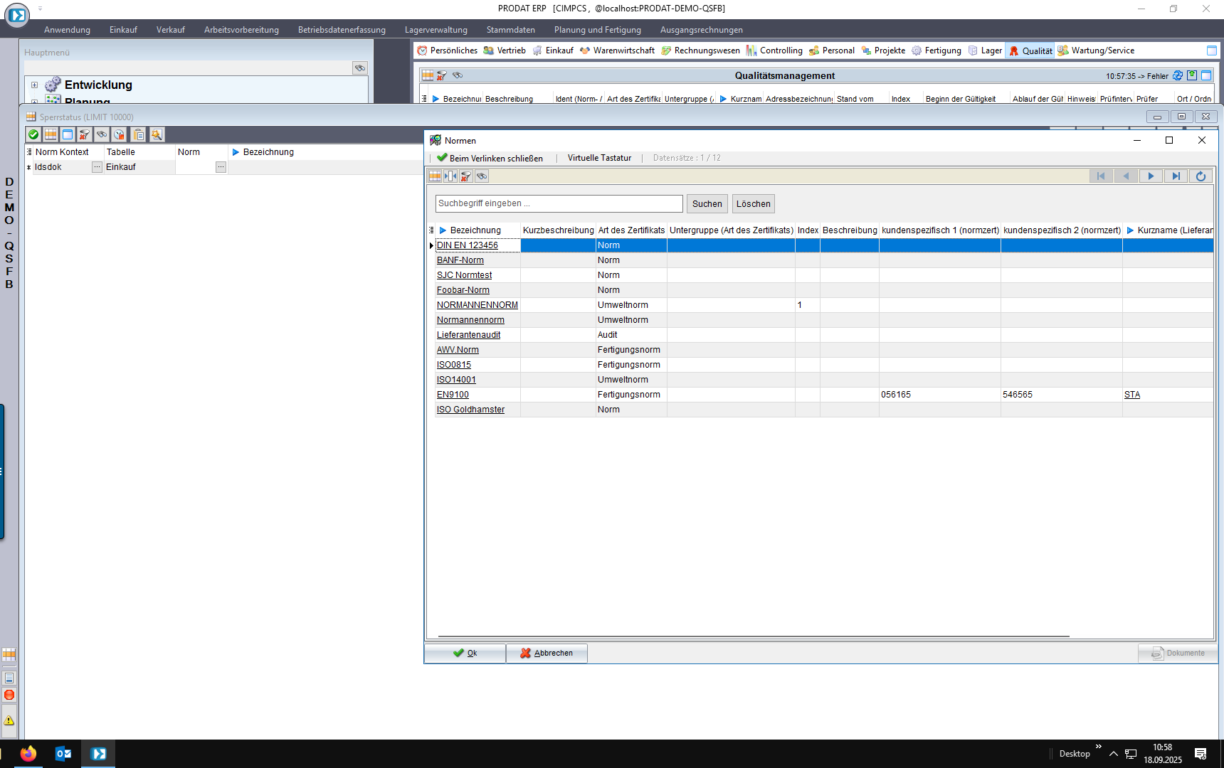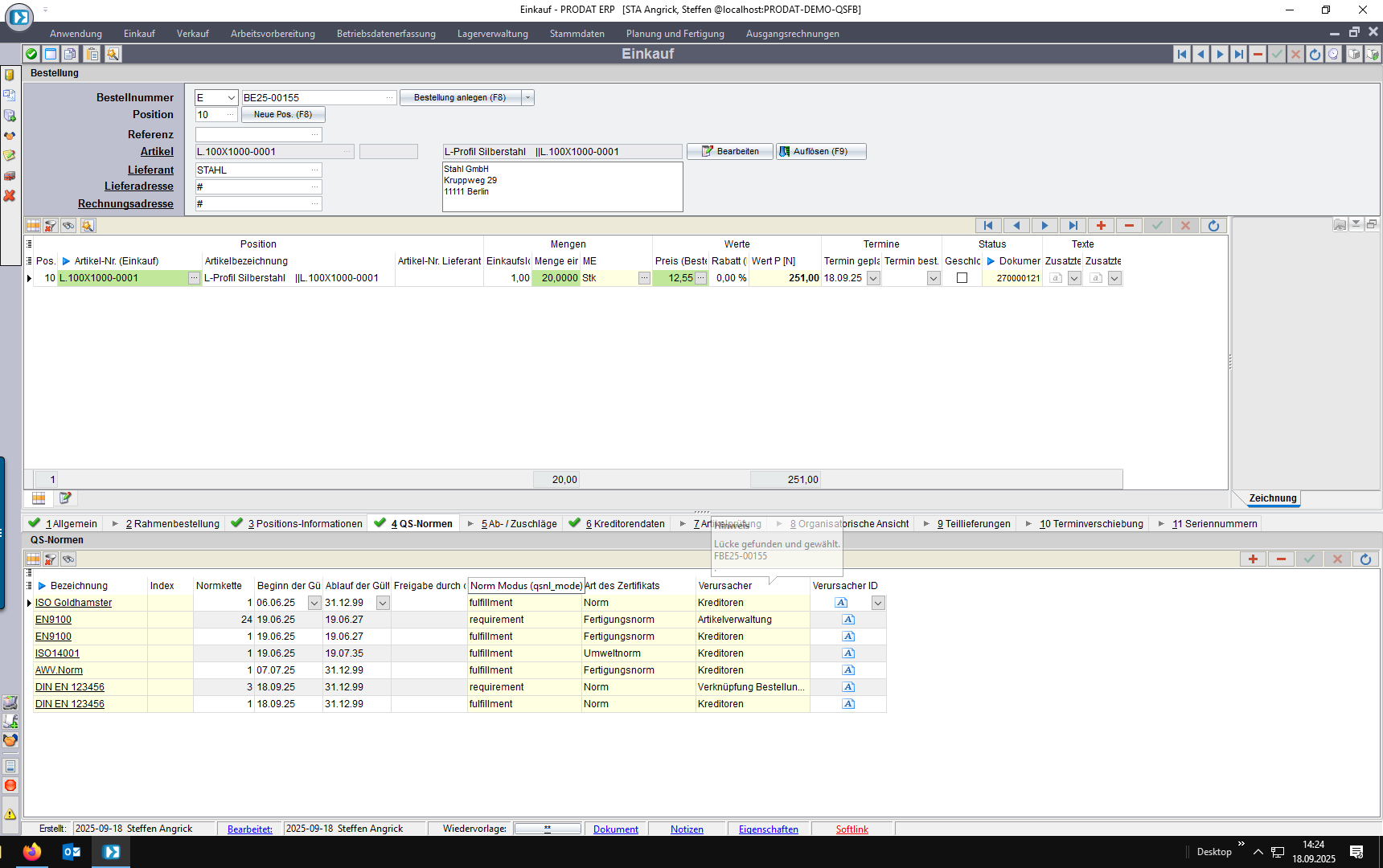 Wird ein Kundenauftrag, eine ABK oder eine BANF angelegt, prüft das System automatisch, ob Artikel/Adresse eine Norm oder ein Zertifikat fordert.