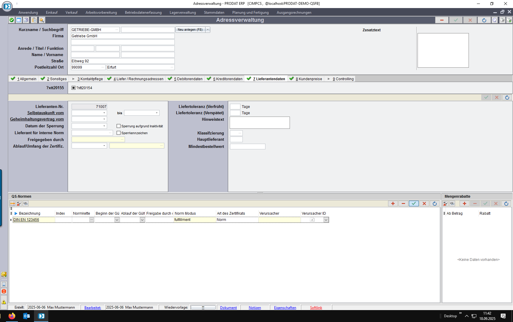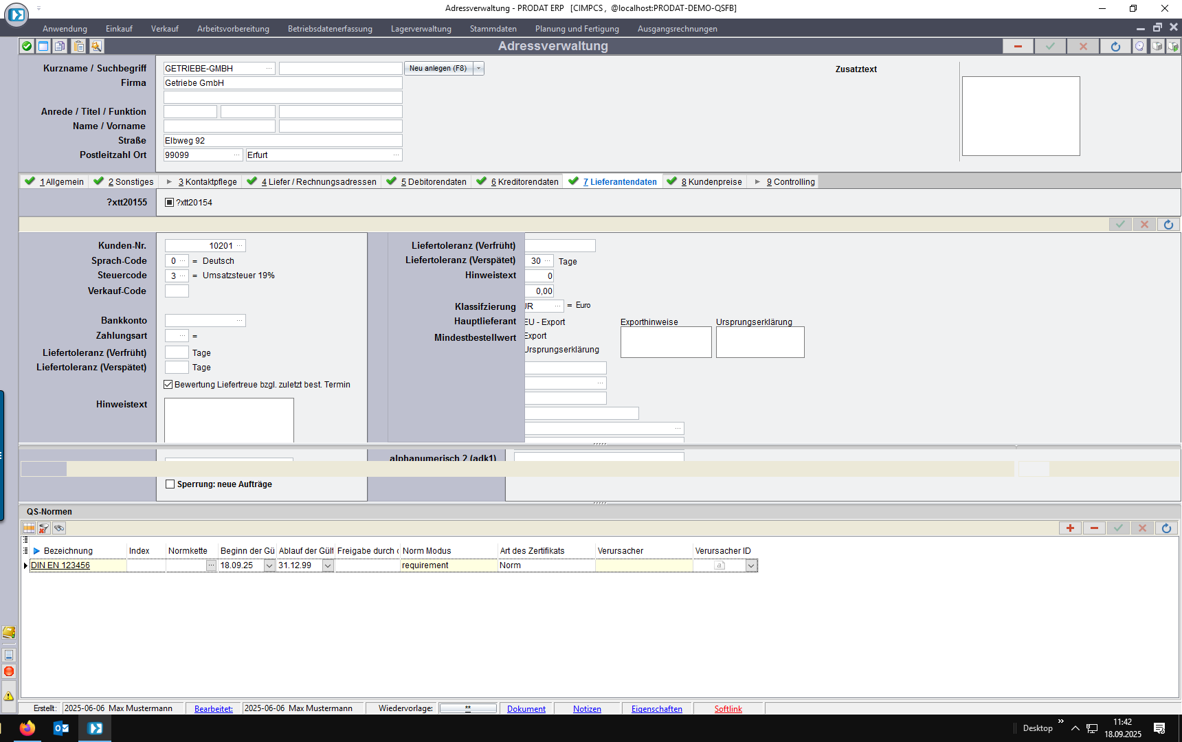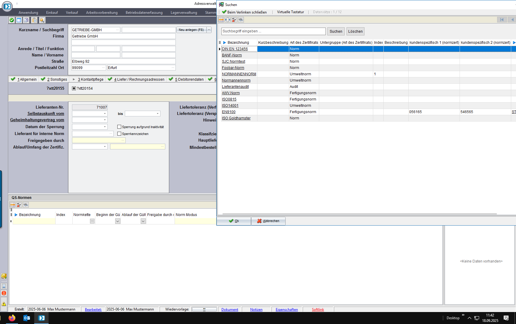 Handelt es sich um einen Lieferanten, der die Normforderungen/das Zertifikat erfüllt, ist die in den Lieferantendaten zu hinterlegen.