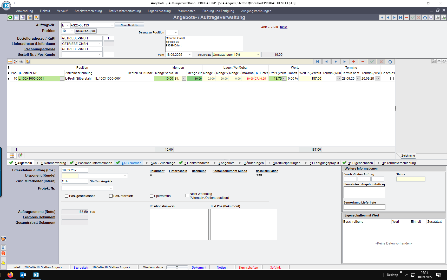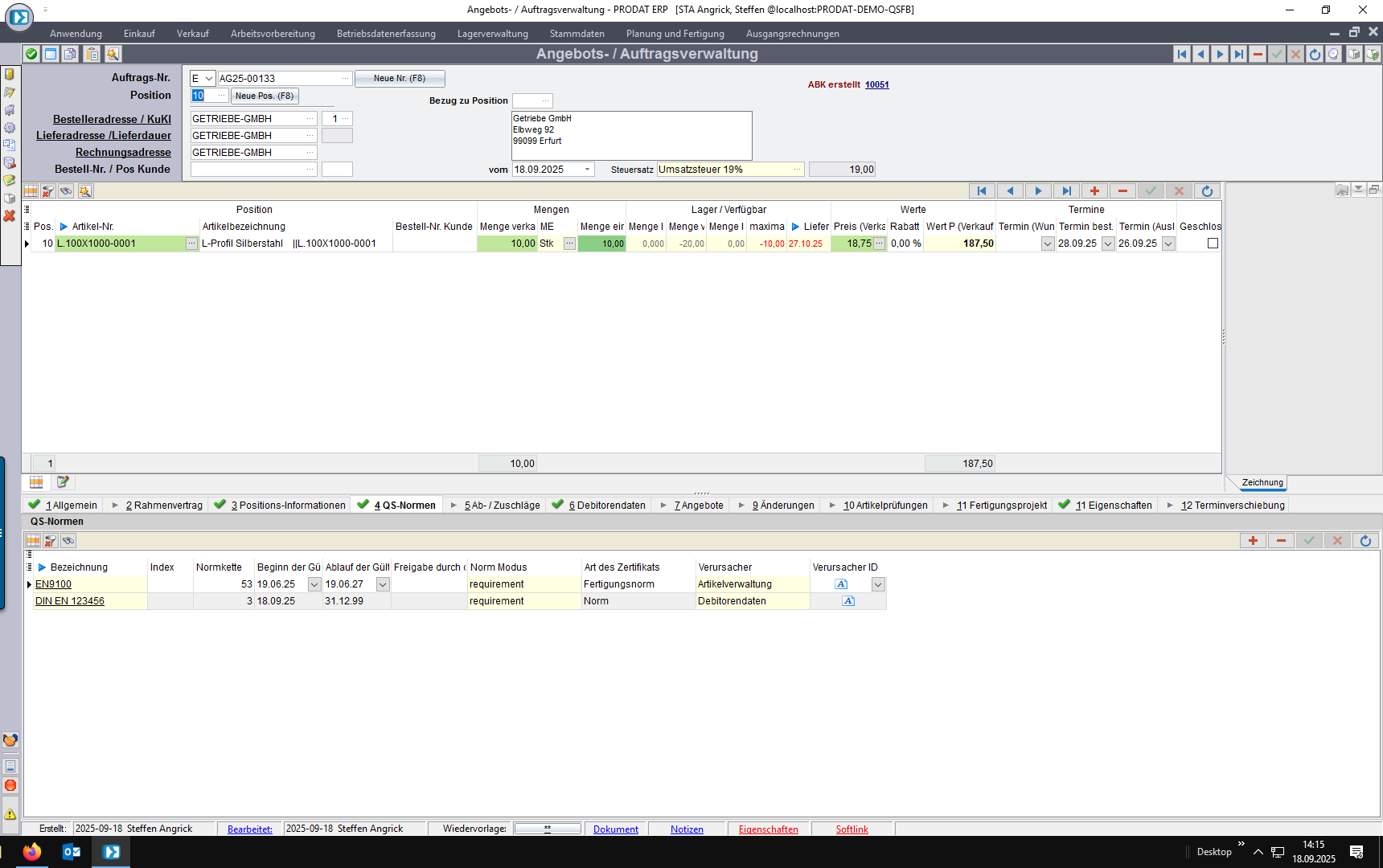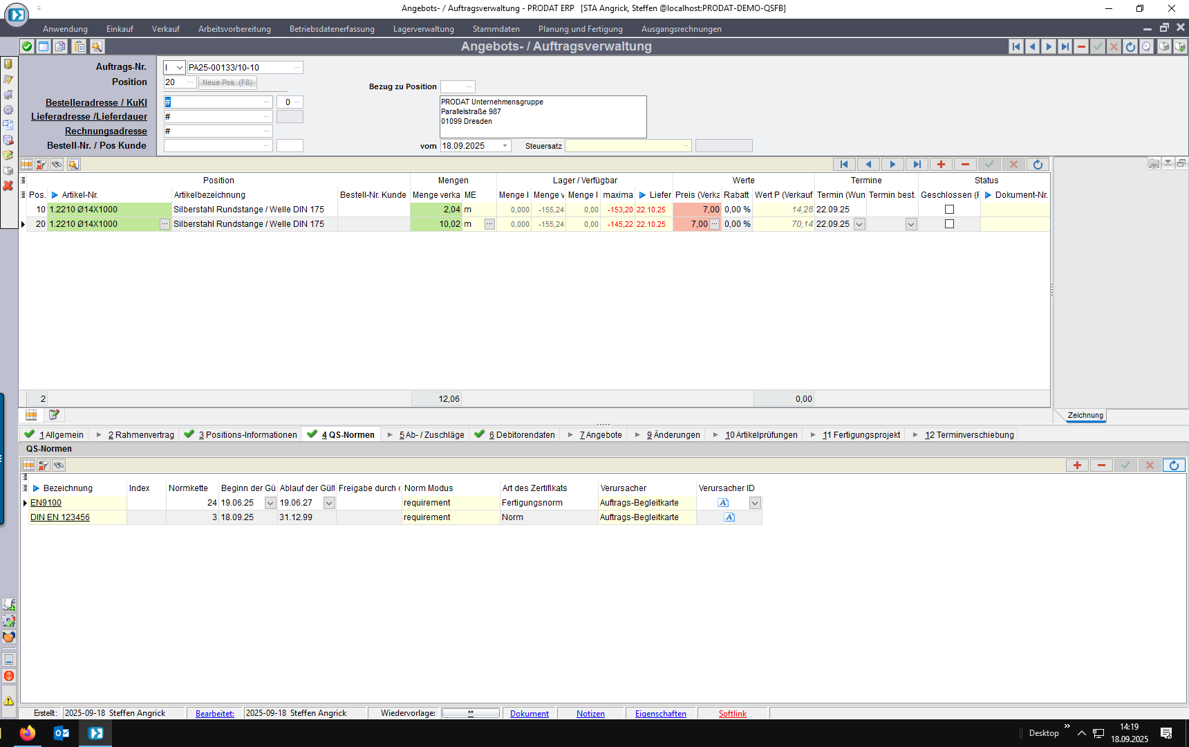 Wenn Sie einen Verkaufsauftrag anlegen, prüft das System automatisch die vorhandenen Normforderungen für den jeweiligen Artikel und Kunden und übernimmt diese in den Auftrag.