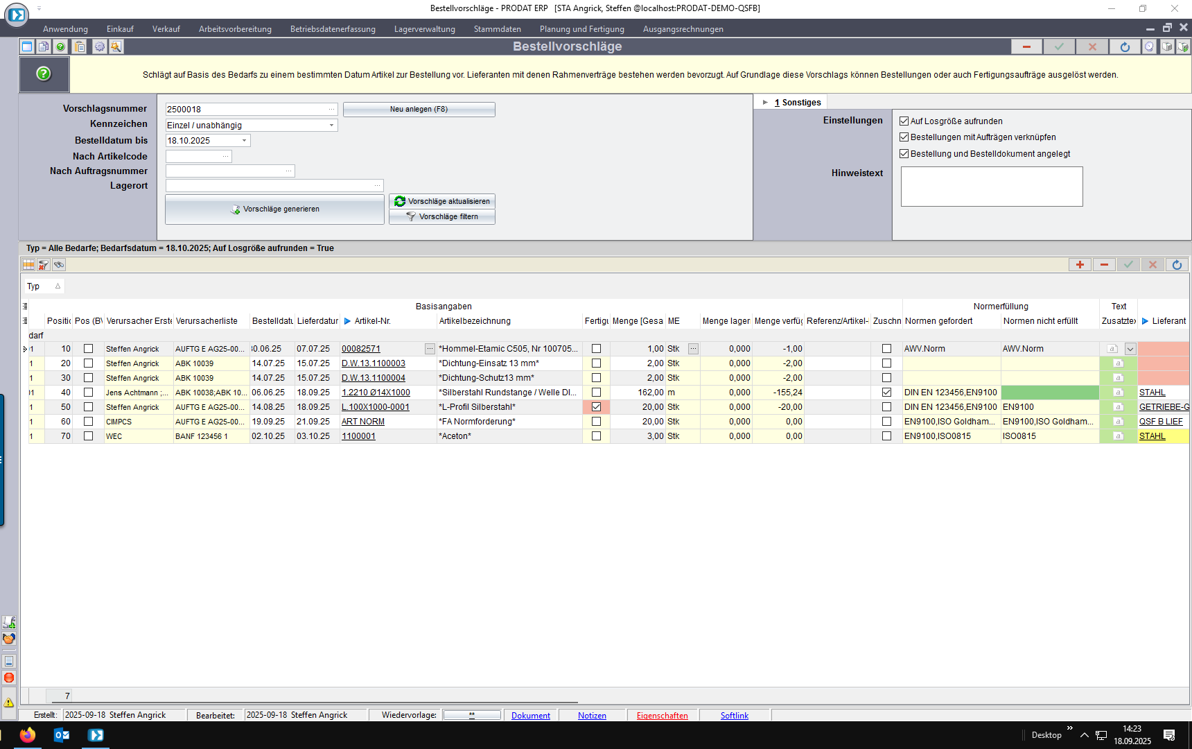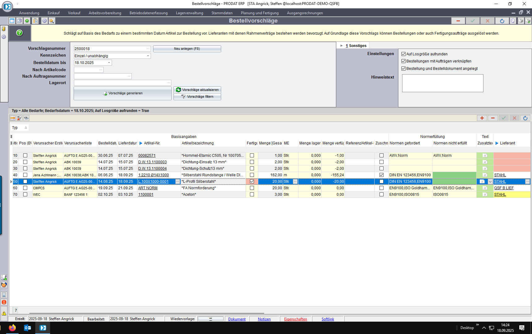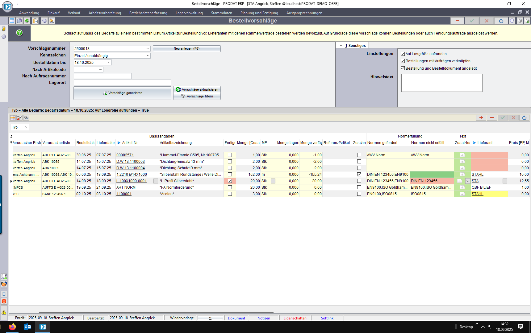 Im Bestellvorschlag wird die Normforderung der Bedarfsverursacher der Normerfüllung des Lieferanten gegenübergestellt. Dabei wir die nicht erfüllte Norm angezeigt.