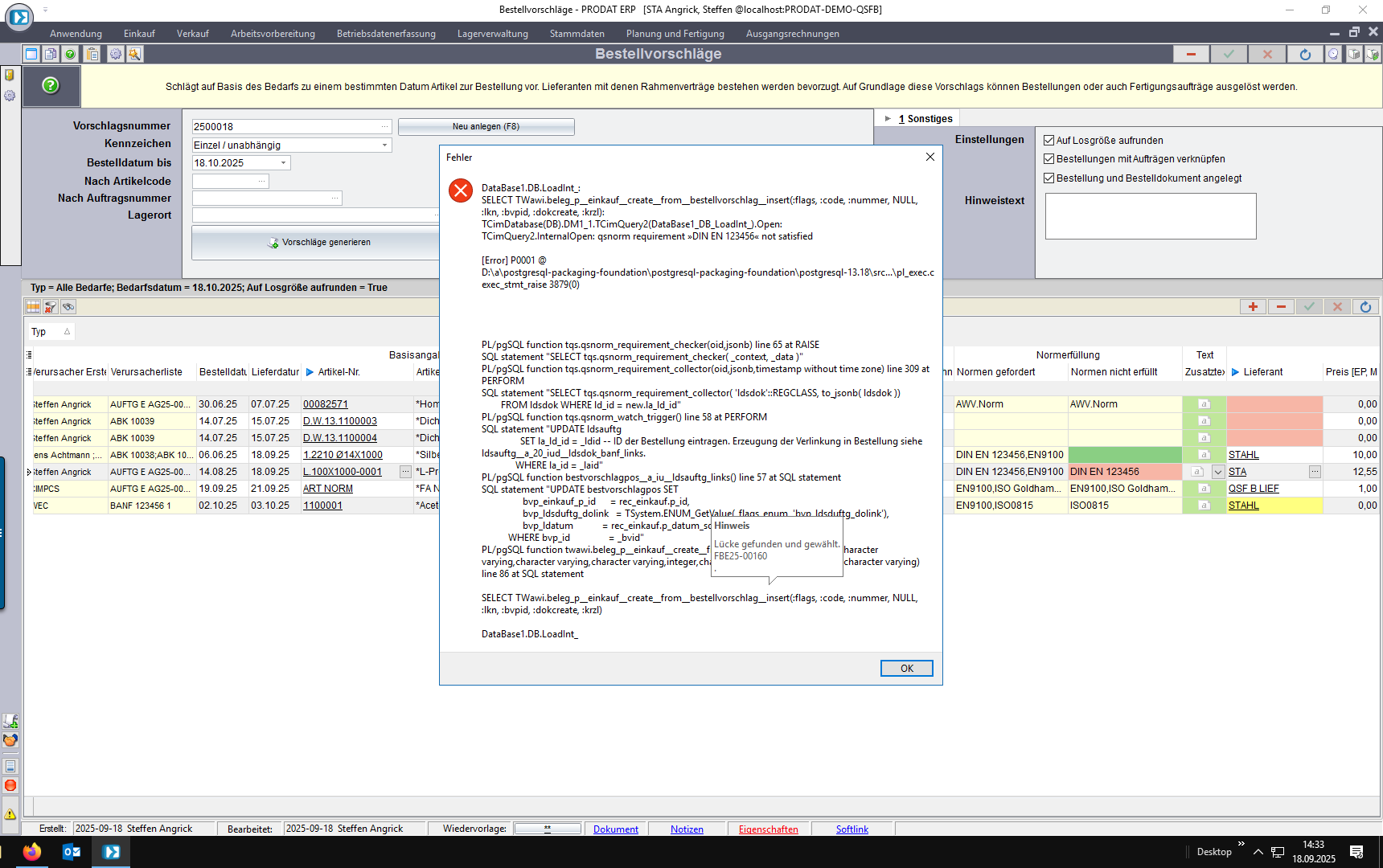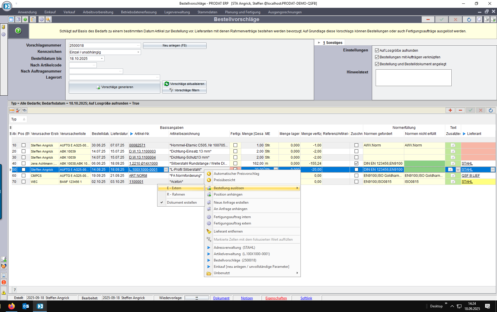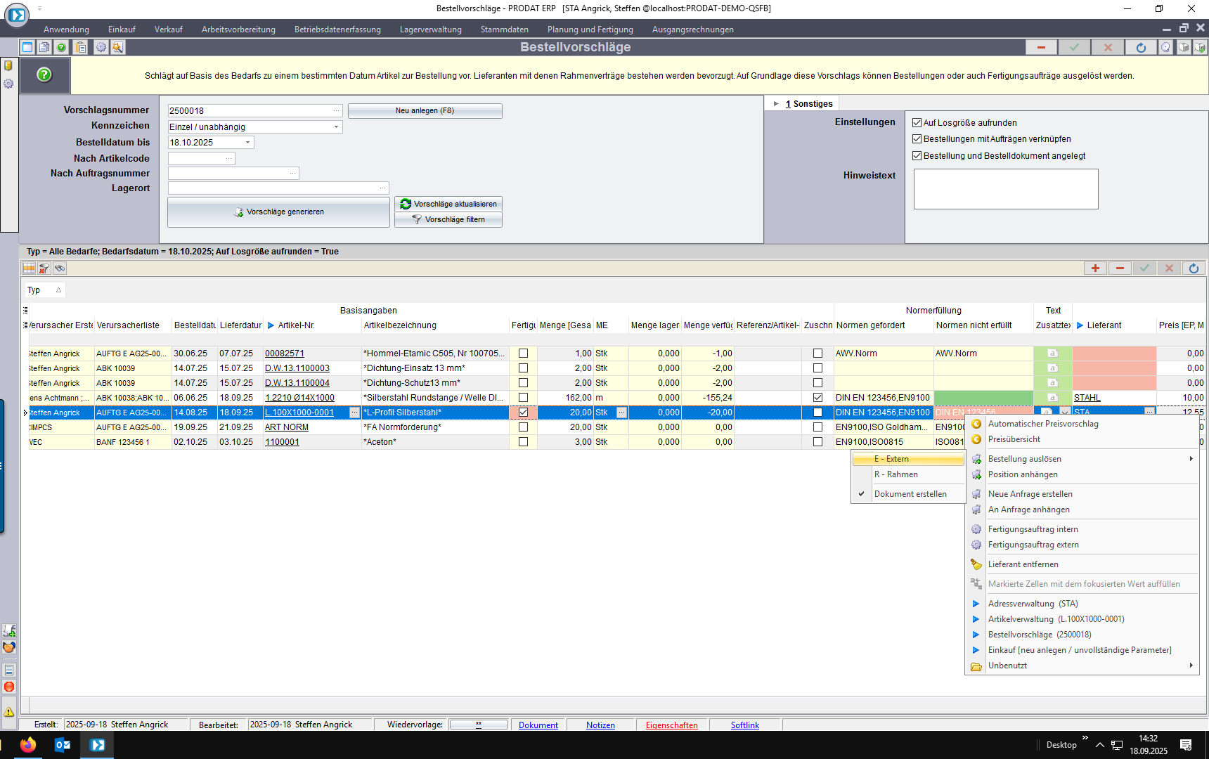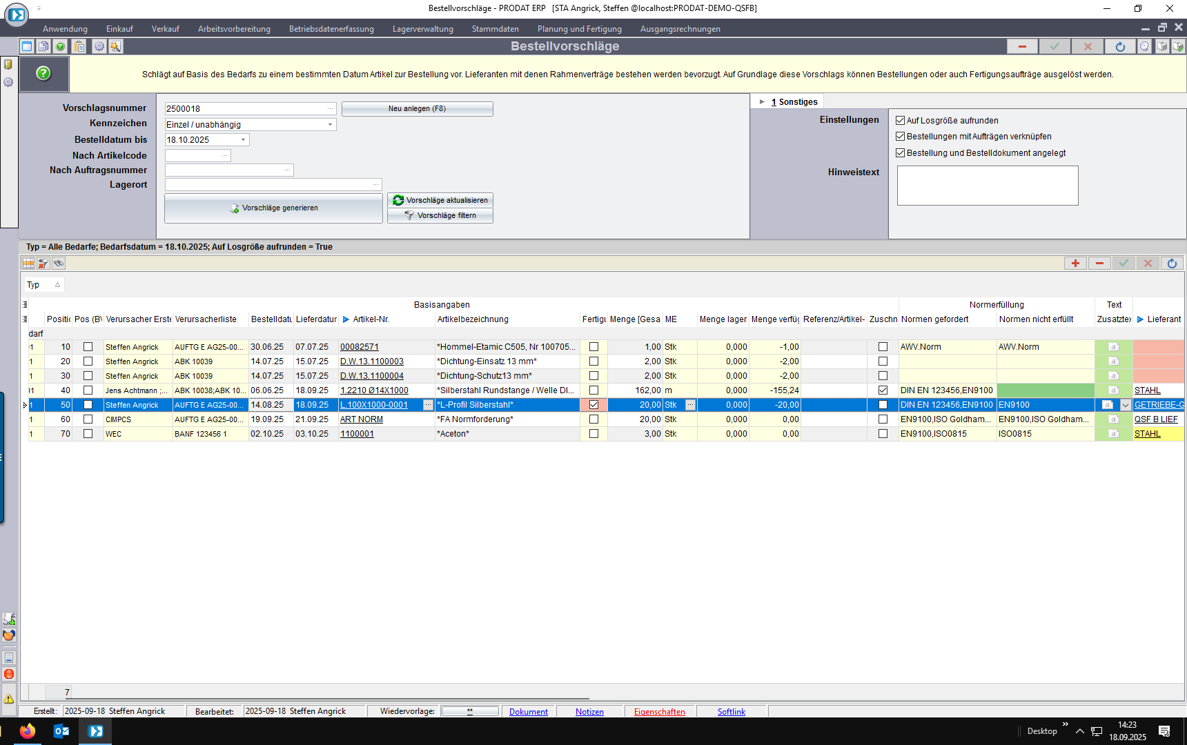 Im Bestellvorschlag wird die Normforderung der Bedarfsverursacher der Normerfüllung des Lieferanten gegenübergestellt. Dabei wir die nicht erfüllte Norm angezeigt.