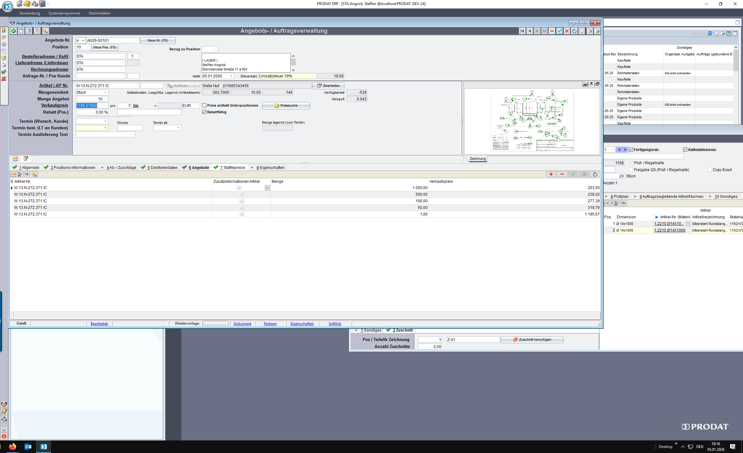 Es wird automatisch der für die Menge geltende Preis eingetragen sowie ggf. gültige Staffeln im Register 7 ergänzt.