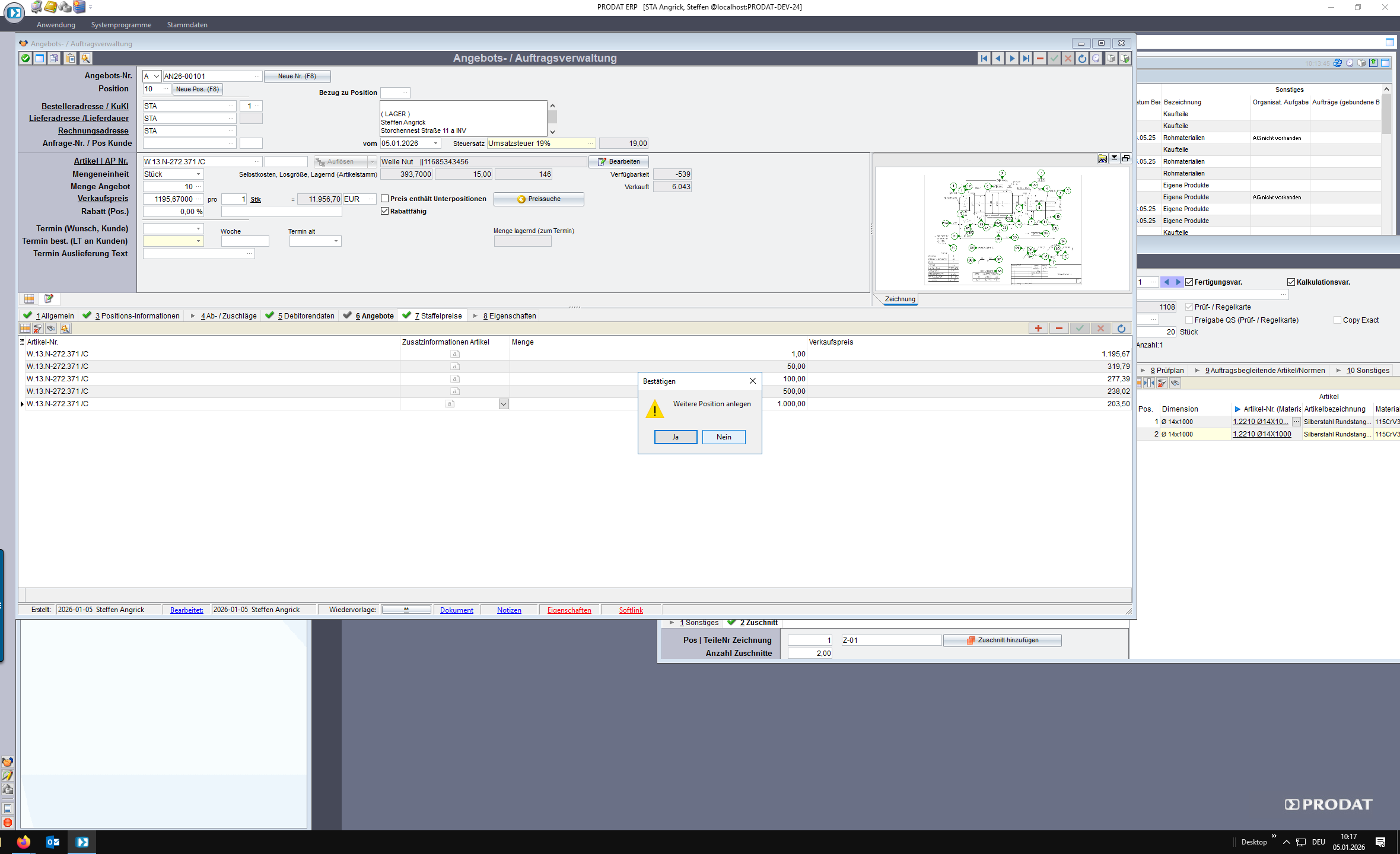 Klick auf „Nein“ Button, wenn keine weiteren Positionen dem Angebot ergänzt werden sollen.